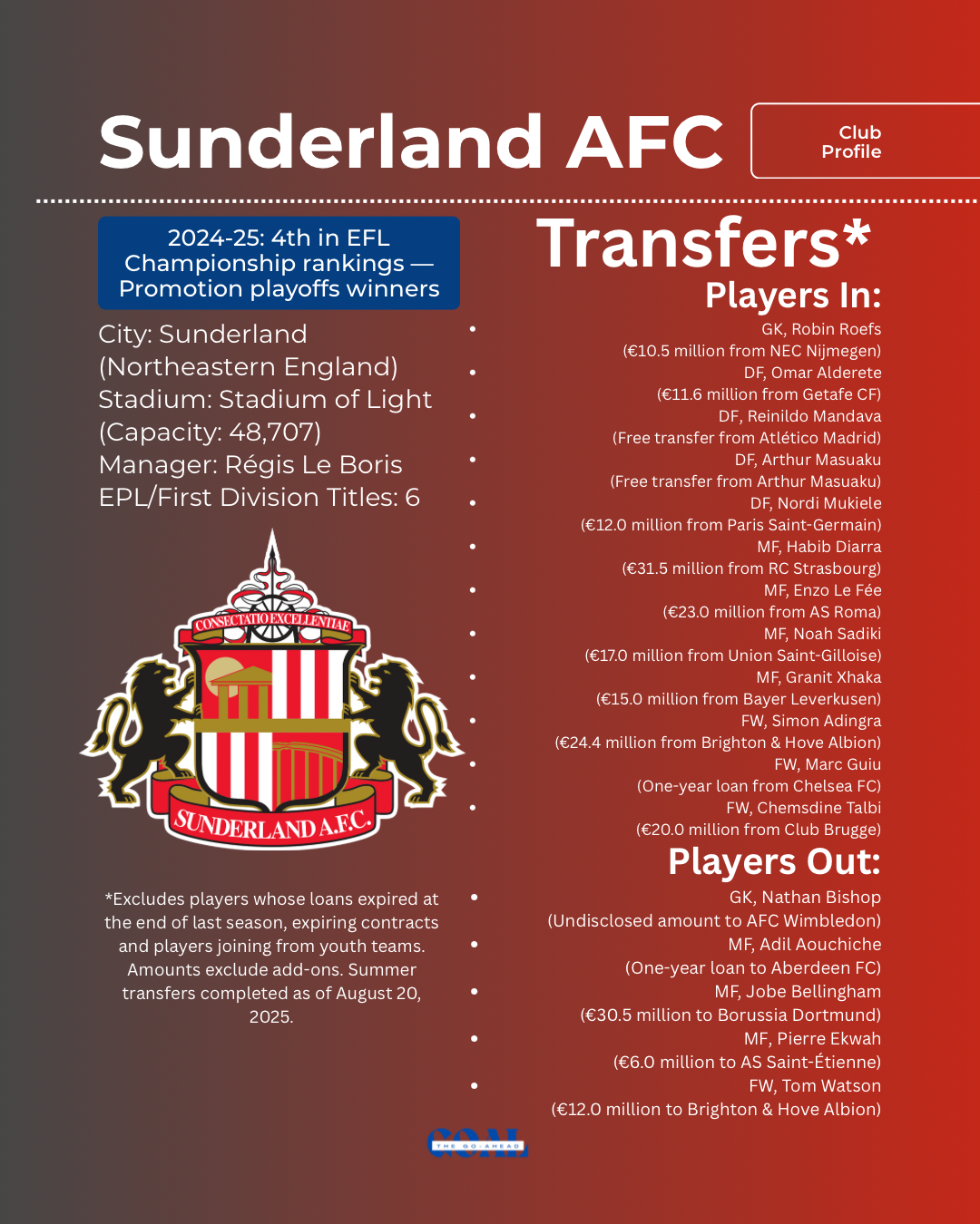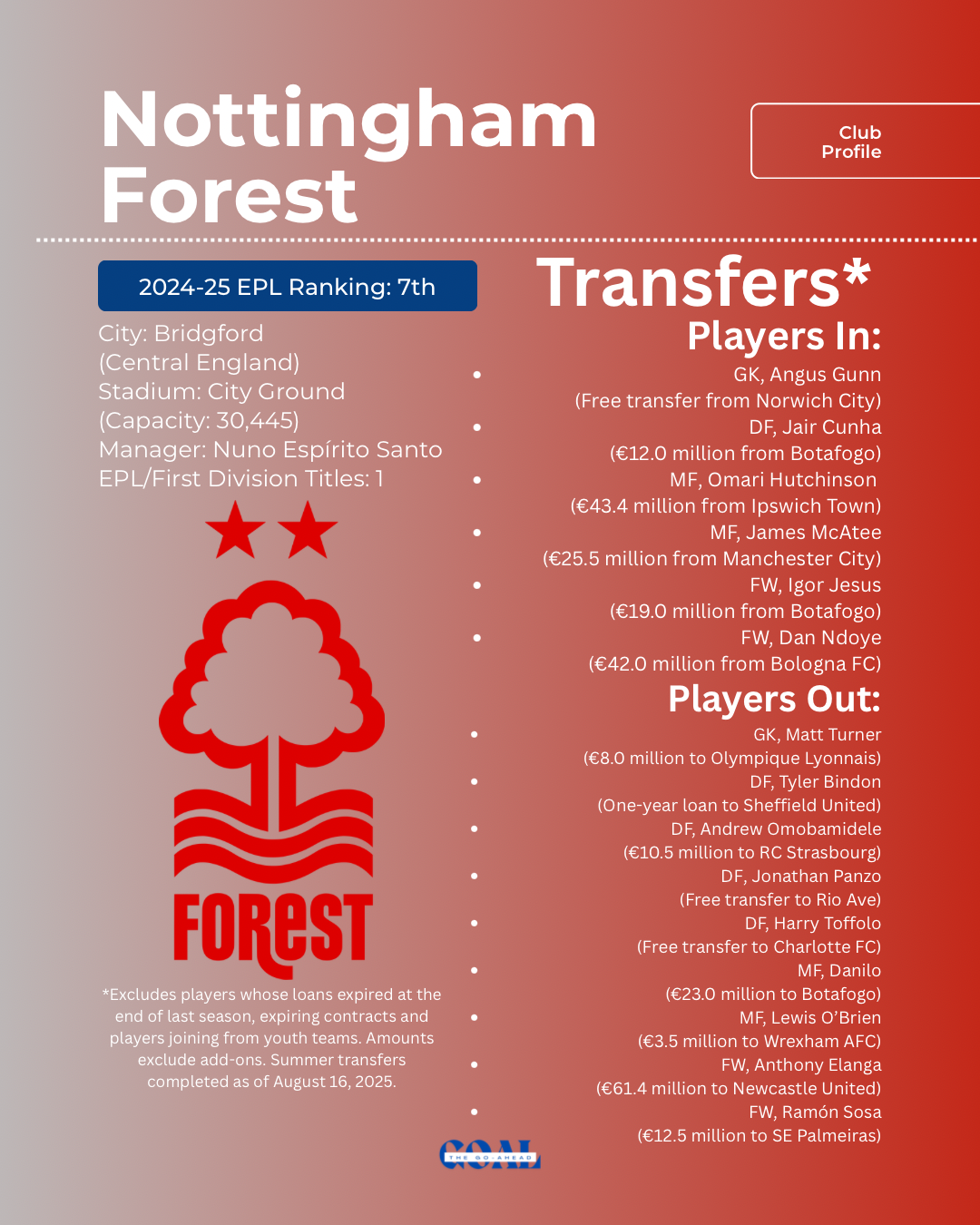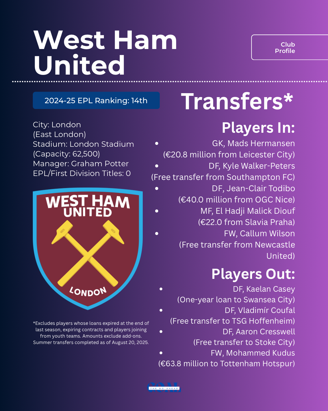These EPL club previews include text and posters detailing a short biography of the club — including the club’s stadium, its capacity, the manager and the number of EPL titles won — and the summer 2025 transfers: both incoming and outgoing players. The transfers section excludes the following: