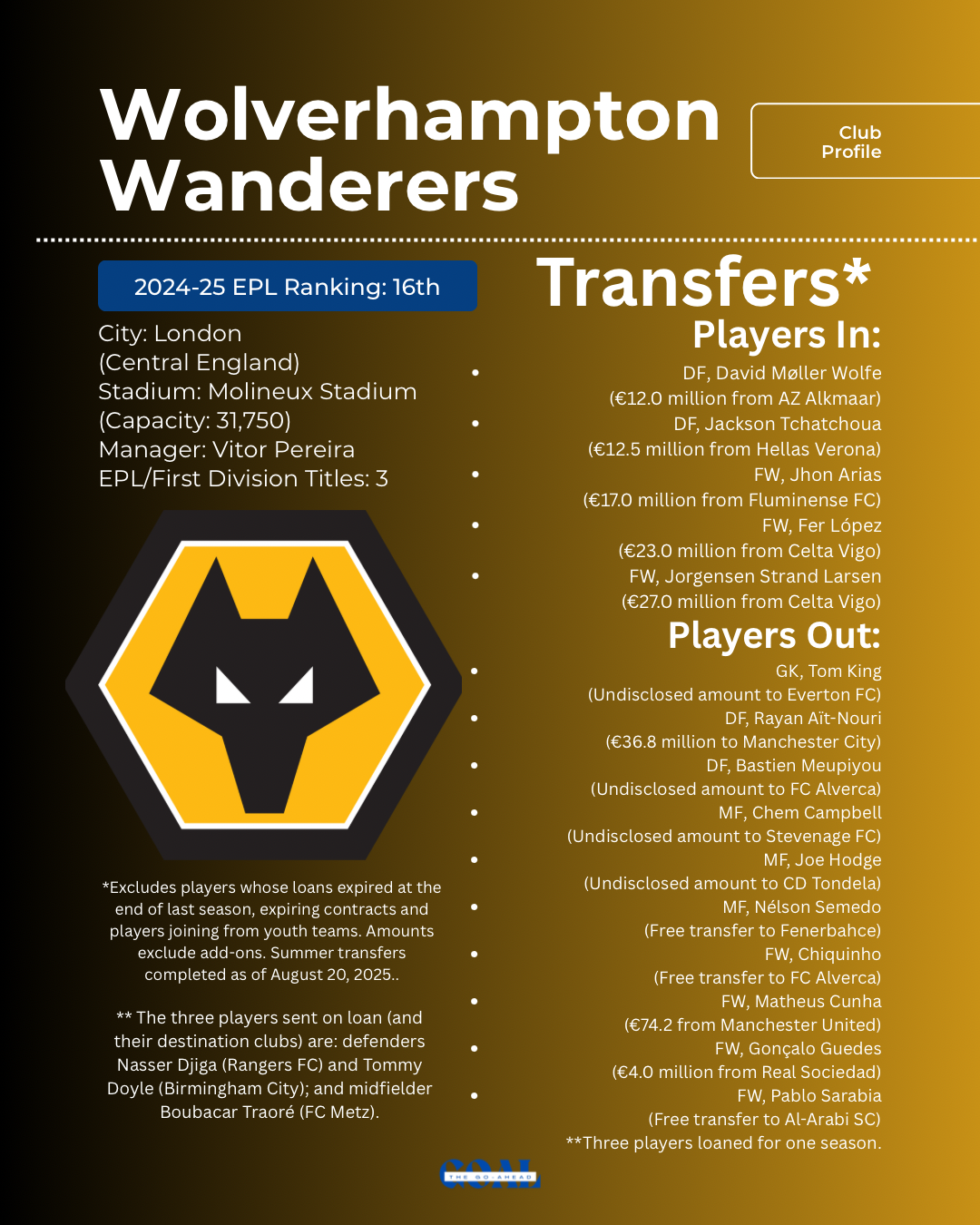 Since August 20, Wolves signed two additional players and sold or loaned six additional players.