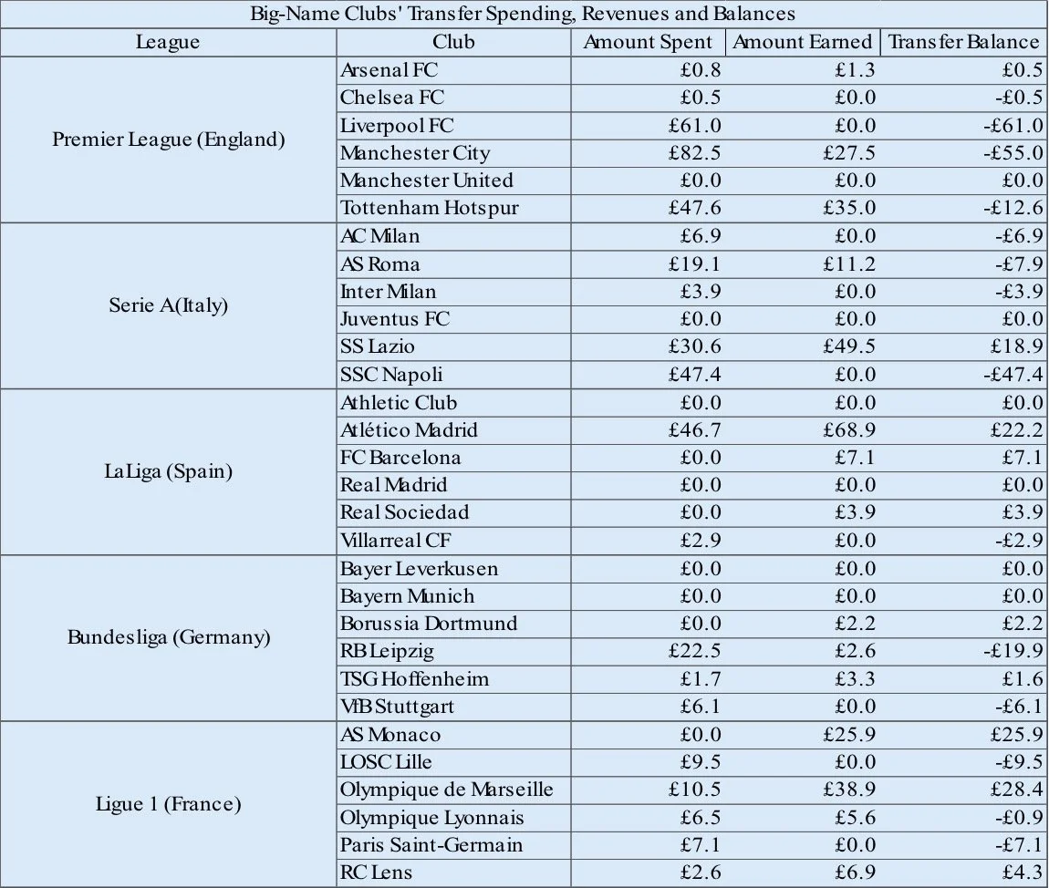The table below shows the transfer spending, revenues and balances of six clubs from each of the top five European leagues. The clubs indicated in the table are among the best and most-valuable clubs from those leagues. The amounts are in millions.