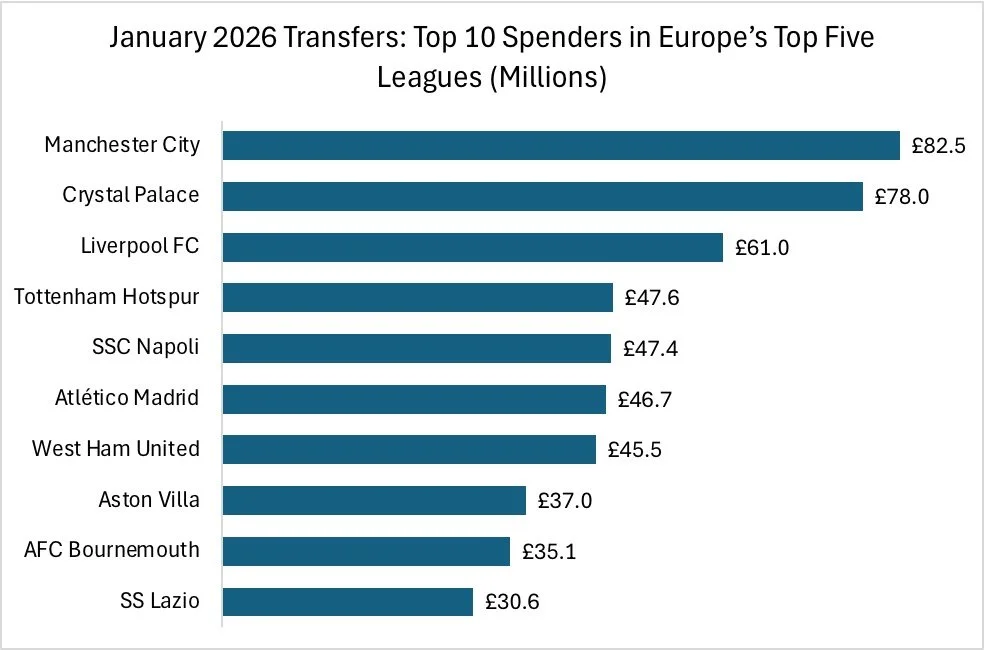 Data from the January 2026 Transfer Tracker demonstrate that this season’s 20 EPL clubs collectively spent the largest amount of money on signings compared to all other leagues during the transfer window. In total, they spent £458.5 million, of which the four top-spending clubs — Manchester City, Crystal Palace, Liverpool and Tottenham, in descending order — spent £269.1 million. City’s spending went towards forward Antoine Semenyo (£62.5 million) and defender Marc Guéhi (£20.0 million), while Palace’s spending materialized into the signings of forwards Jørgen Strand Larsen (£43.0 million) and Brennan Johnson (£35.0 million).