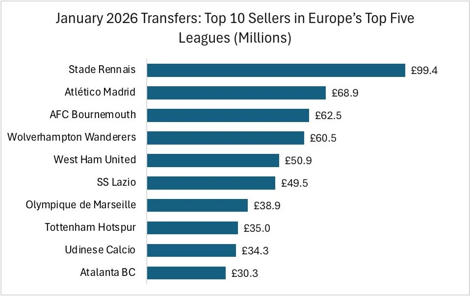 Figure 2 shows the 10 clubs in Europe’s top five leagues that generated the highest revenue from player sales during the January 2026 transfer window.