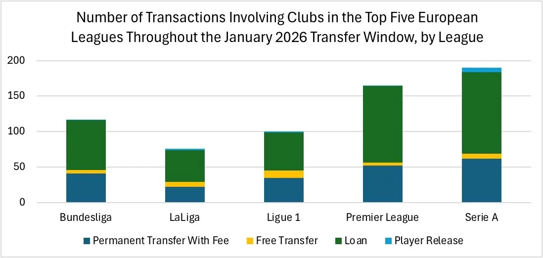 Figure 2 presents the number of transactions completed by clubs within the top five European leagues throughout the January 2026 transfer window, by league. Data indicated in the figure are divided into four categories: permanent transfers with fees, free transfers, loan transfers and released players who had their contracts terminated.