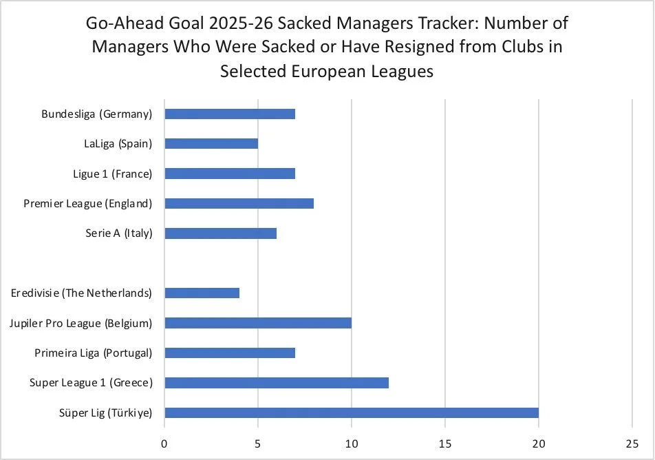 The figure below shows the number of managers that were sacked or resigned, by league, since the start of the 2025-26 season. This tracker does not include caretaker managers who were replaced by permanent managers.