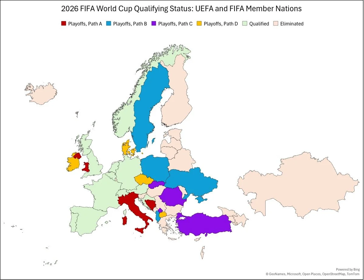 In Europe, 16 nations — which are divided equally into four paths — will compete in semifinal matches, with eight of these nations advancing to the final round. The four winning nations — one per path — will qualify for the 2026 World Cup.