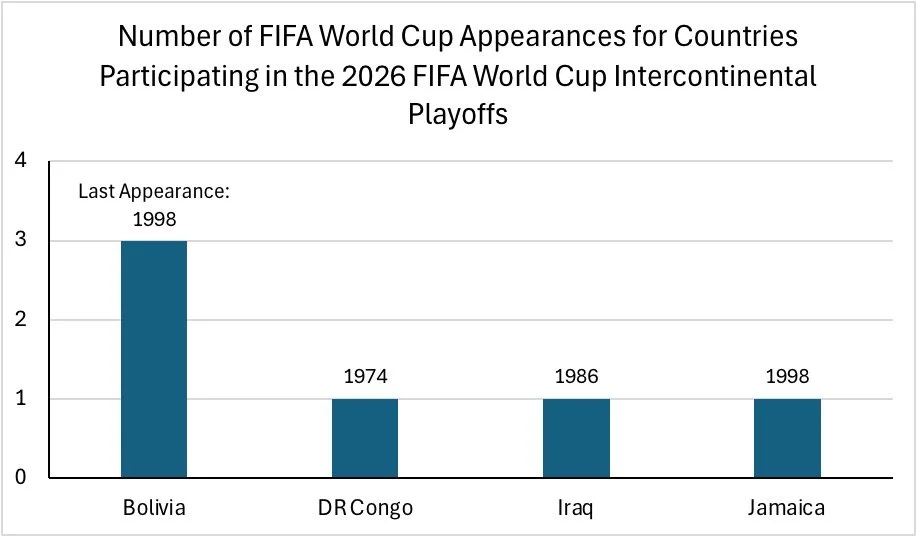 The six nations have a combined total of six World Cup tournament appearances, half of which belong to Bolivia. DR Congo, Iraq and Jamaica each have one appearance, having participated in 1974, 1986 and 1998, respectively. New Caledonia and Suriname are both seeking their first World Cup tournament appearance.