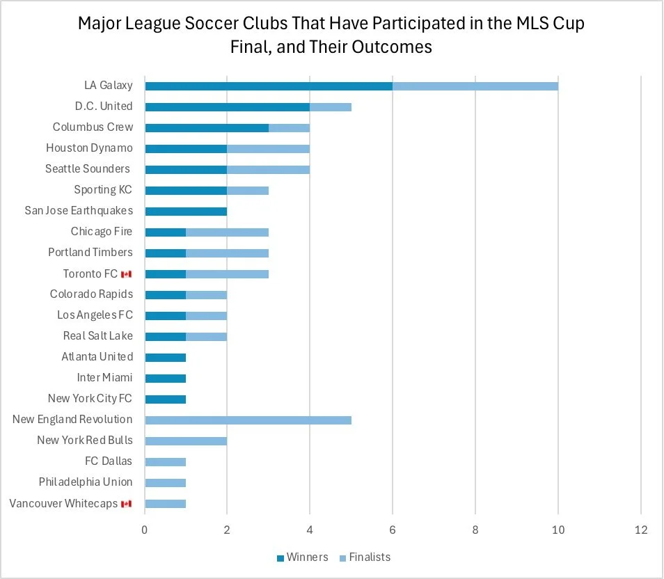 Figure 1 shows the number of MLS Cup titles and MLS Cup Final appearances by club.
