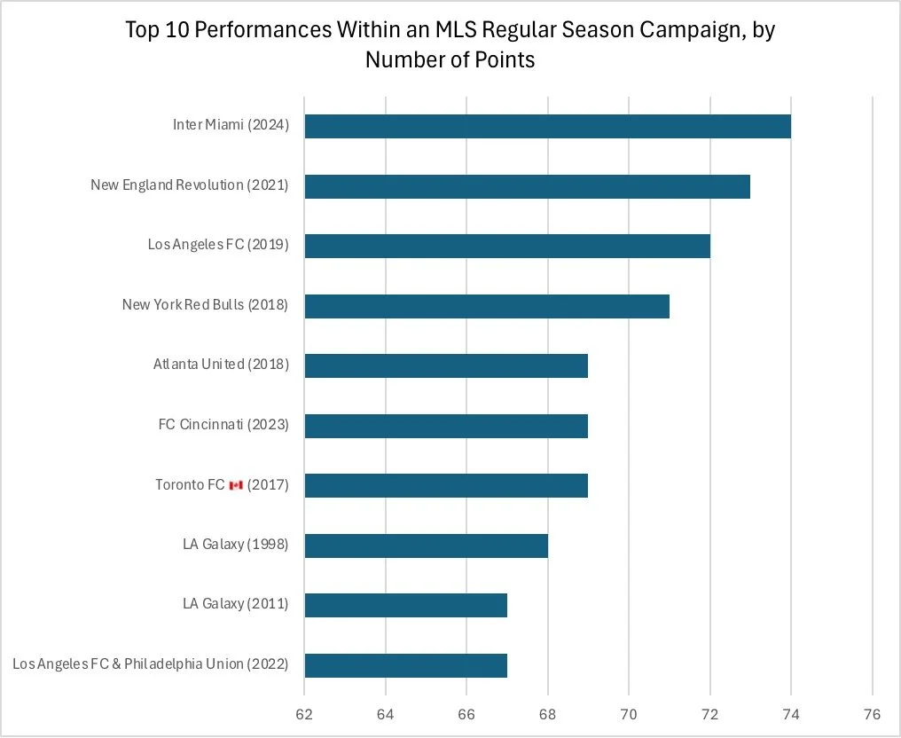 The record for the highest number of points recorded in a single season was broken five times in the past nine years. Miami currently hold the record with 74 points in 2024, surpassing New England Revolution’s 73-point total in 2021. Before that, LAFC established a new benchmark in 2019, recording 72 points. Toronto began this record-breaking trend in 2017 with 68 points, eclipsing LAG’s 67-point season in 1998. (Miami, New England, LAFC and Toronto achieved these tallies in 34 regular season matches, while LAG achieved their 67-point tally in 32 matches.)