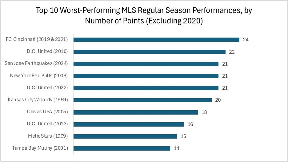 Accounting for points per match, the worst performer goes to FC Cincinnati — twice. In their inaugural 2019 season, that club collected merely 24 points. Although it is the highest tally among the top 10 worst performers, Cincinnati generated an MLS all-time worst 1.42 points per match. The club repeated this abysmal performance in 2021.